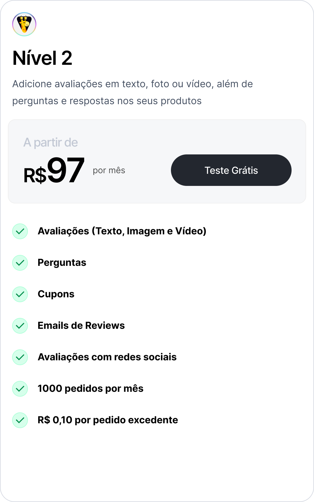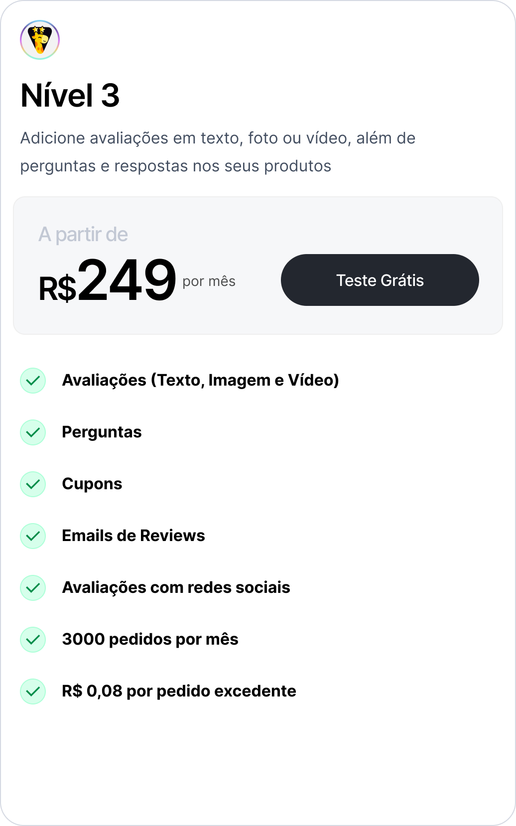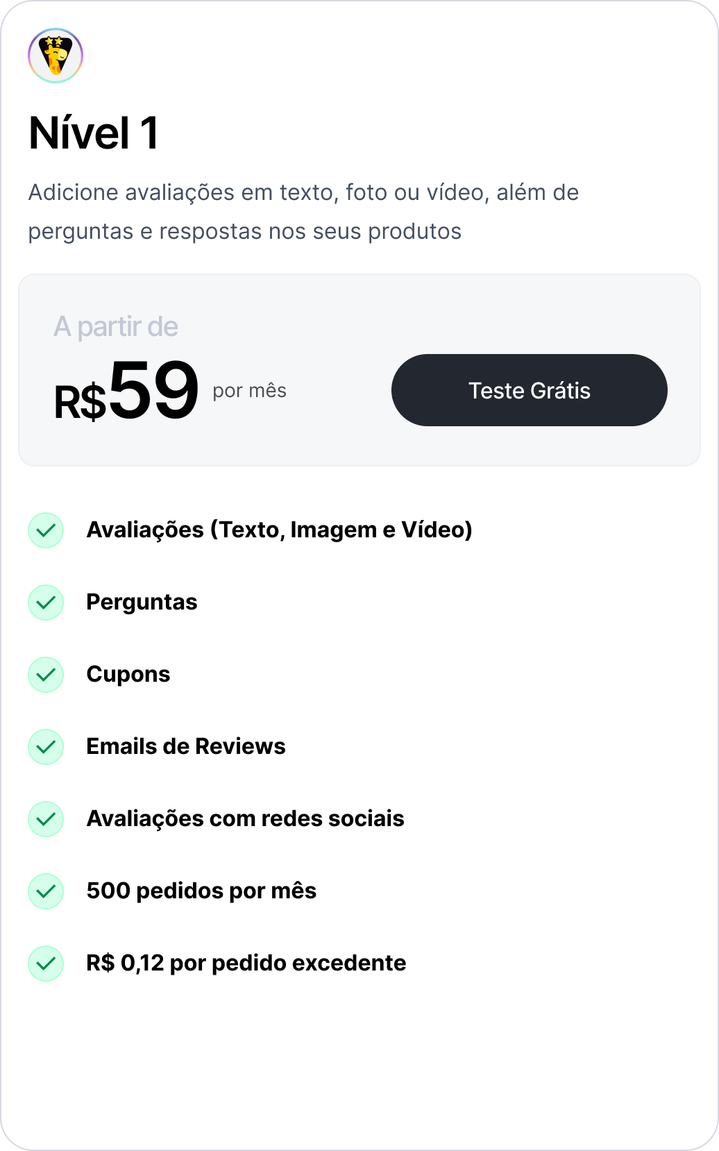Um novo jeito de gerar confiança e aumentar vendas: Exiba reviews com fotos, vídeos e redes sociais direto na sua loja. Tire dúvidas de seus clientes com a ferramenta de perguntas e respostas, criando um FAQ.